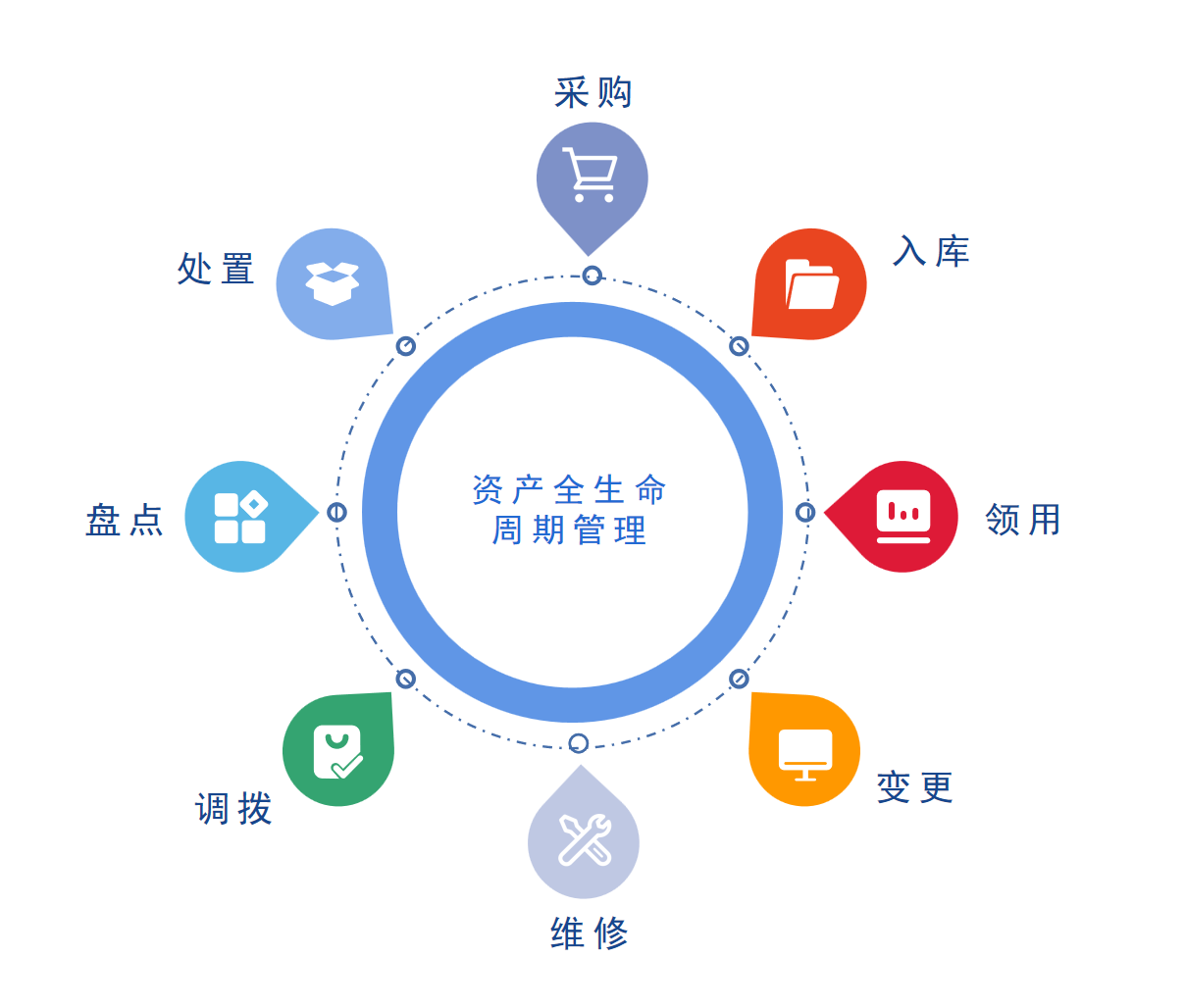 从固定资产采购、入库、领用、变更、维修、调拨、盘点、处置等全流程进行精准跟踪管理。